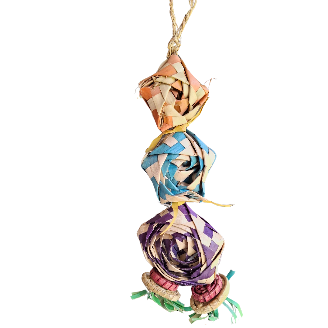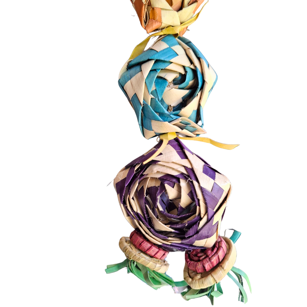 The Bella is a delightful bird toy crafted from natural palm leaves, featuring three beautifully shaped roses and two short dangling stems. Each rose is coloured with bird-safe dye, ensuring a vibrant yet safe playtime for your feathered friends. This enchanting toy not only adds a pop of colour to your bird's space but also encourages foraging and mental stimulation. Stuff seeds into the roses petals to encourage your bird to forage and play.