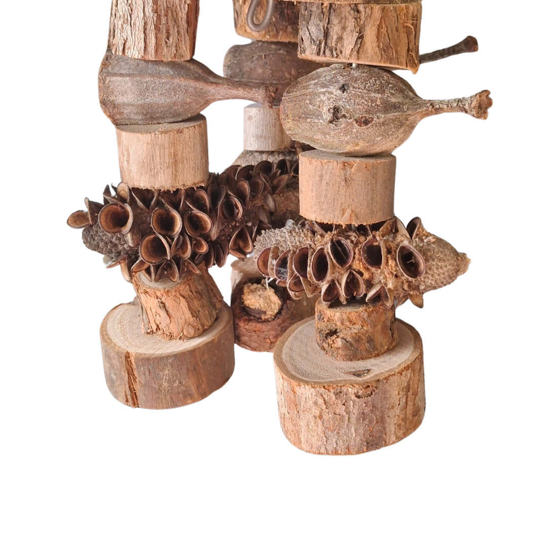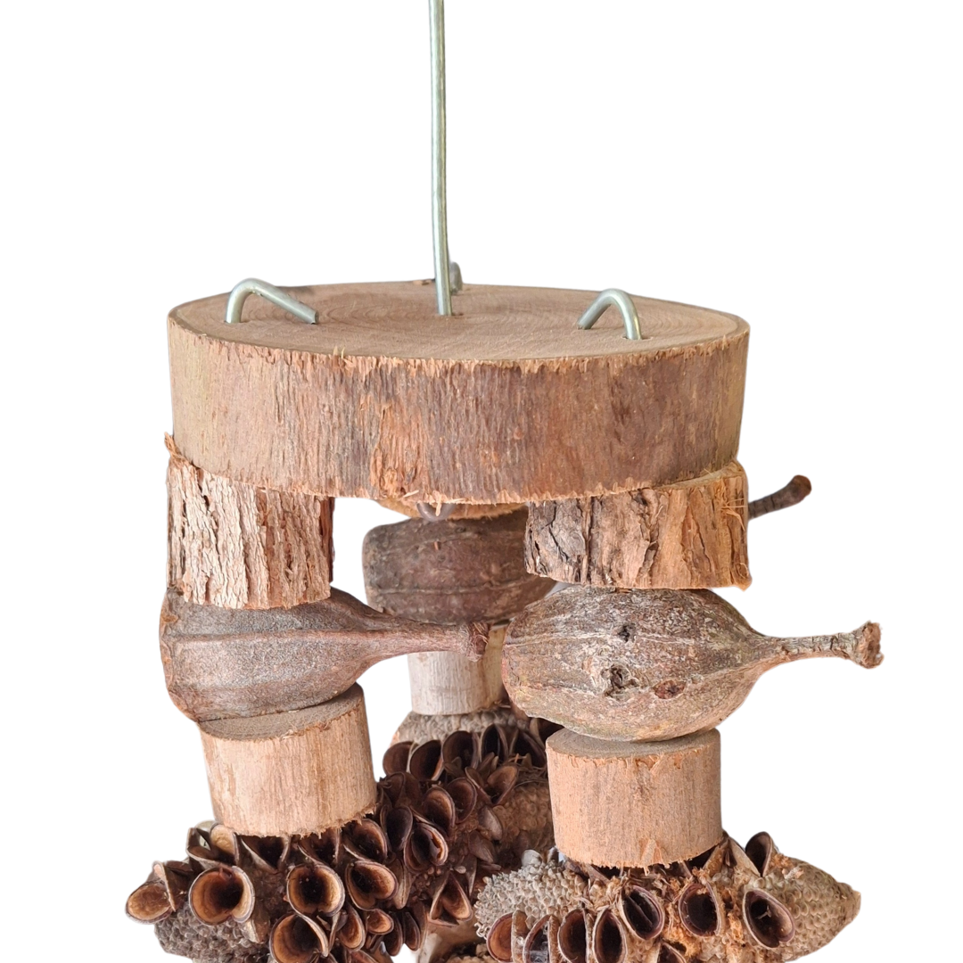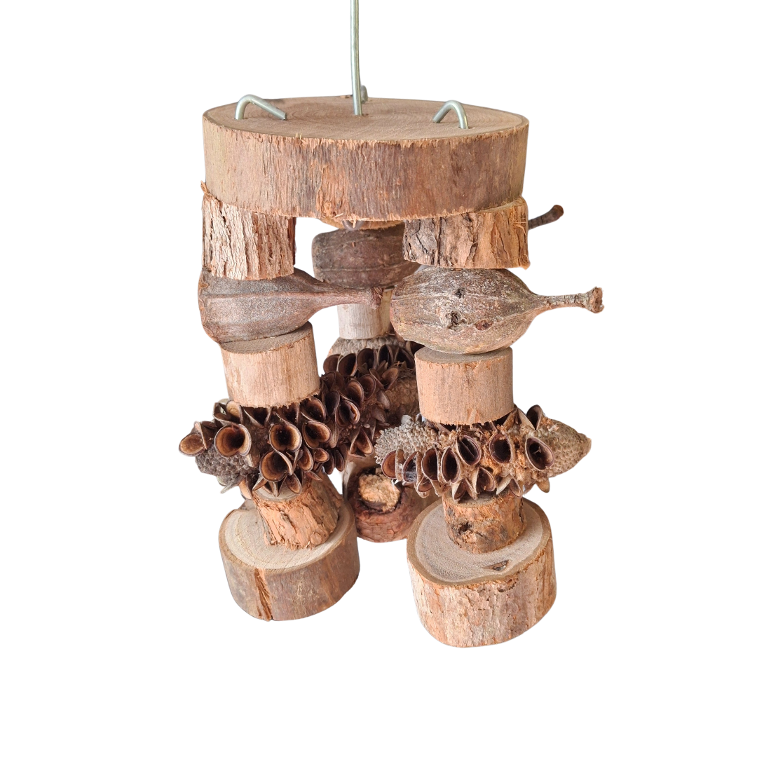 Handmade using chunky Aussie native wood slices, banksia pods, and gumnuts—all stacked onto three metal skewers—this natural toy brings the Aussie outback direct to your bird. The native wood slices still have their bark intact, offering extra shredding fun and a variety of natural surfaces to explore. It’s packed with textures that satisfy your bird’s natural chewing instincts. The skewers hang from a large, thick wood slice at the top, all secured on a sturdy metal skewer that’s ready to hang—making setup super easy.