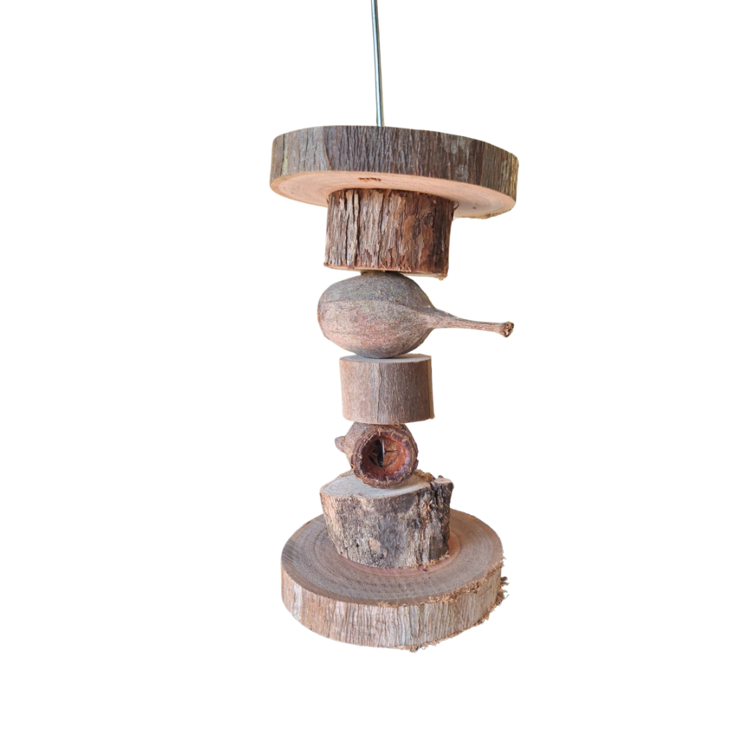 Handmade using chunky Aussie native wood slices and gumnuts, this lightweight hanging dumbbell is made for the little beaks. It features two barky wood discs on either end, with smaller chunky slices and gumnuts stacked along a sturdy stainless-steel skewer—creating a fun hanging toy full of natural texture and movement.