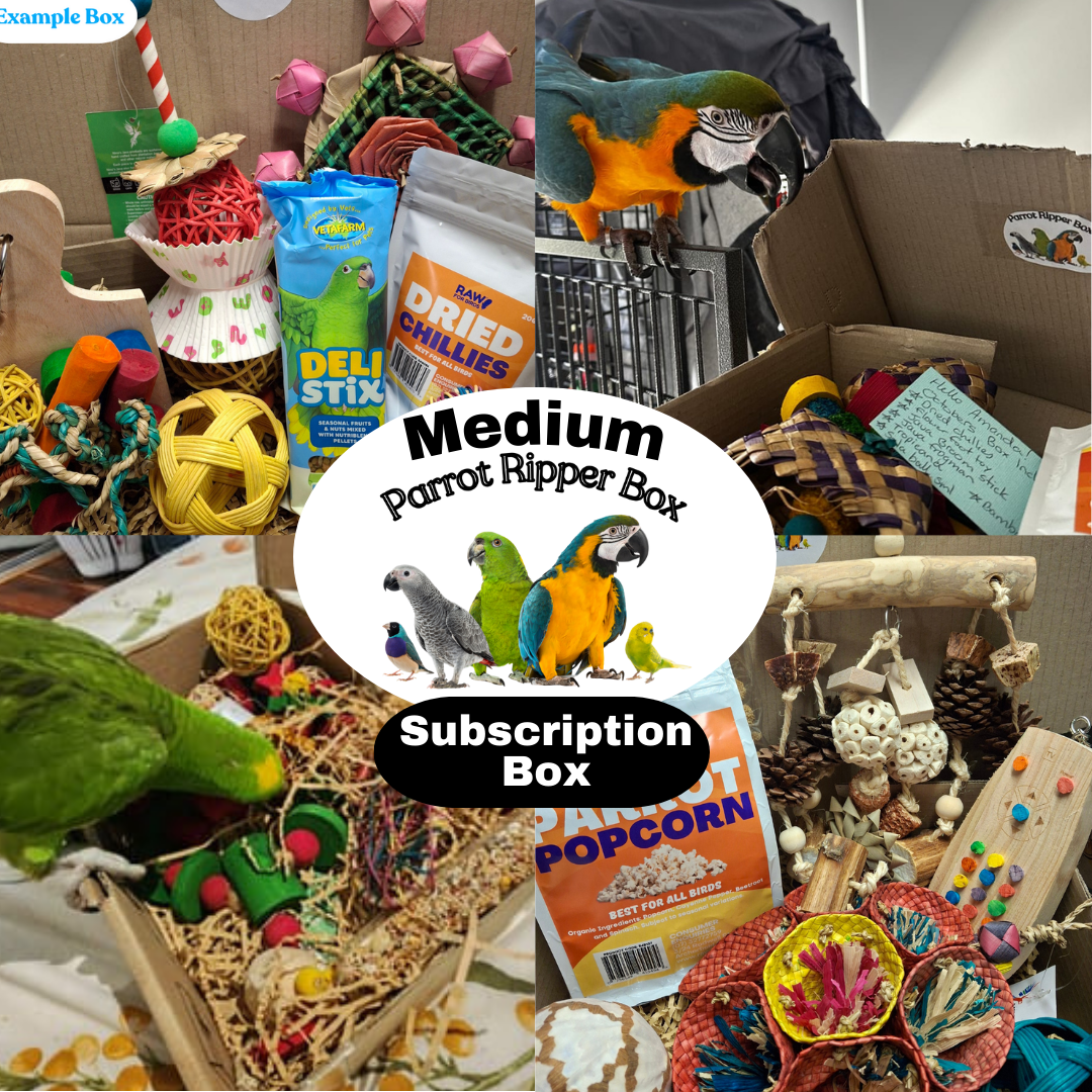Enjoy a Medium Parrot Ripper Box delivered monthly or bi-monthly — packed with shredders, foot toys, and foraging fun to keep your bird happy and entertained!