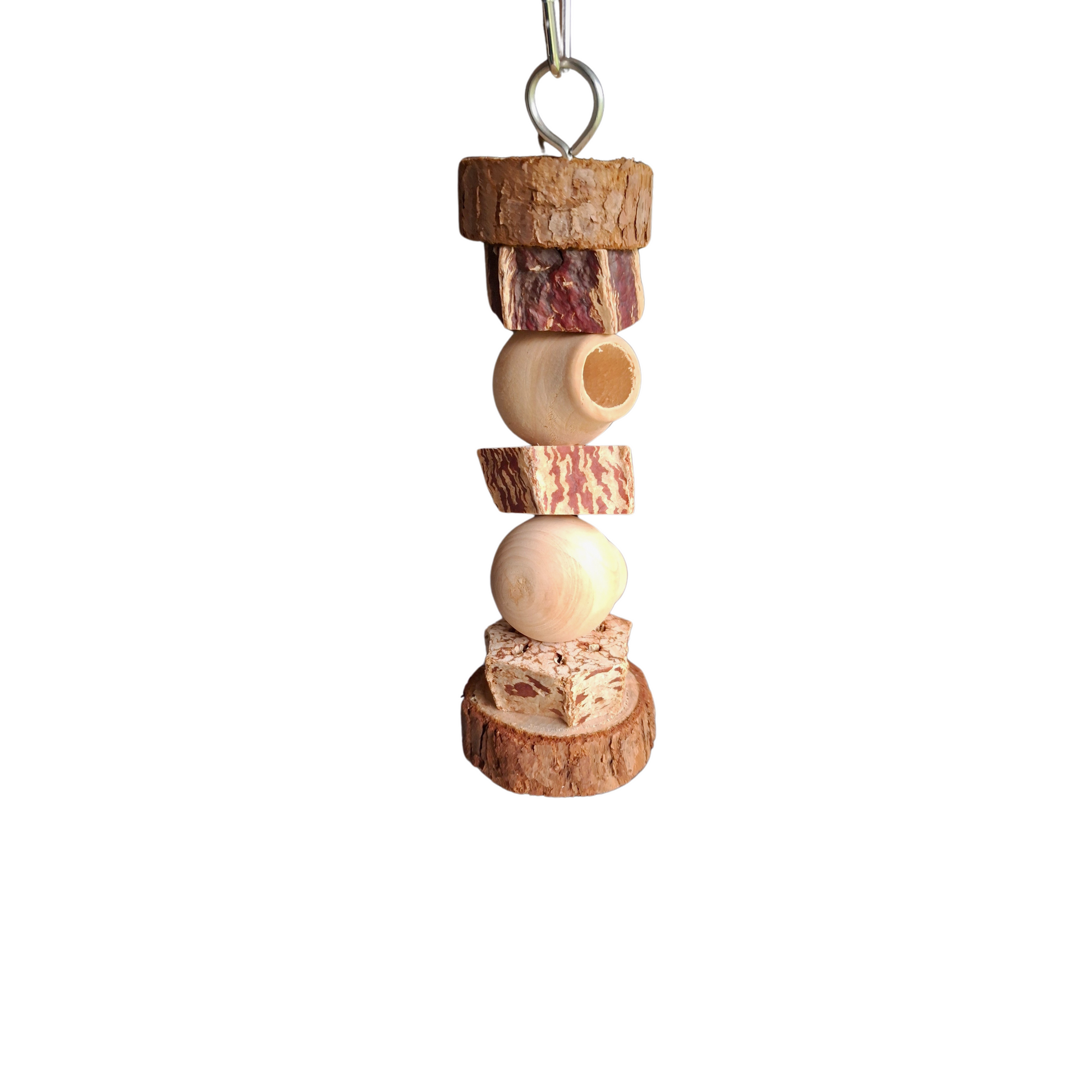 A fun, all-natural toy made for small birds who love to chew and explore! Made with natural wood slices, mahogany slices and wooden gum nuts all stacked on a skewer and ready to hang with a sturdy pear clip. The mix of textures and shapes keeps curious beaks busy, encouraging natural chewing and play.