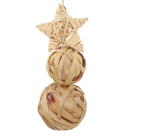 Made with two large hyacinth balls and topped with a rattan star, this charming toy adds a seasonal twist to your bird’s cage. Hang it as-is for a simple, natural decoration your bird can chew and explore — or snip the twine to turn it into three separate foot toys for extra enrichment.
